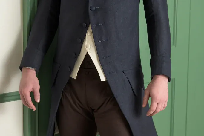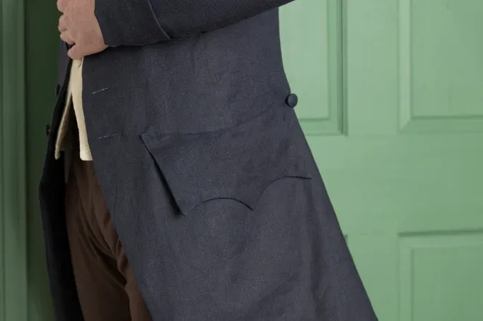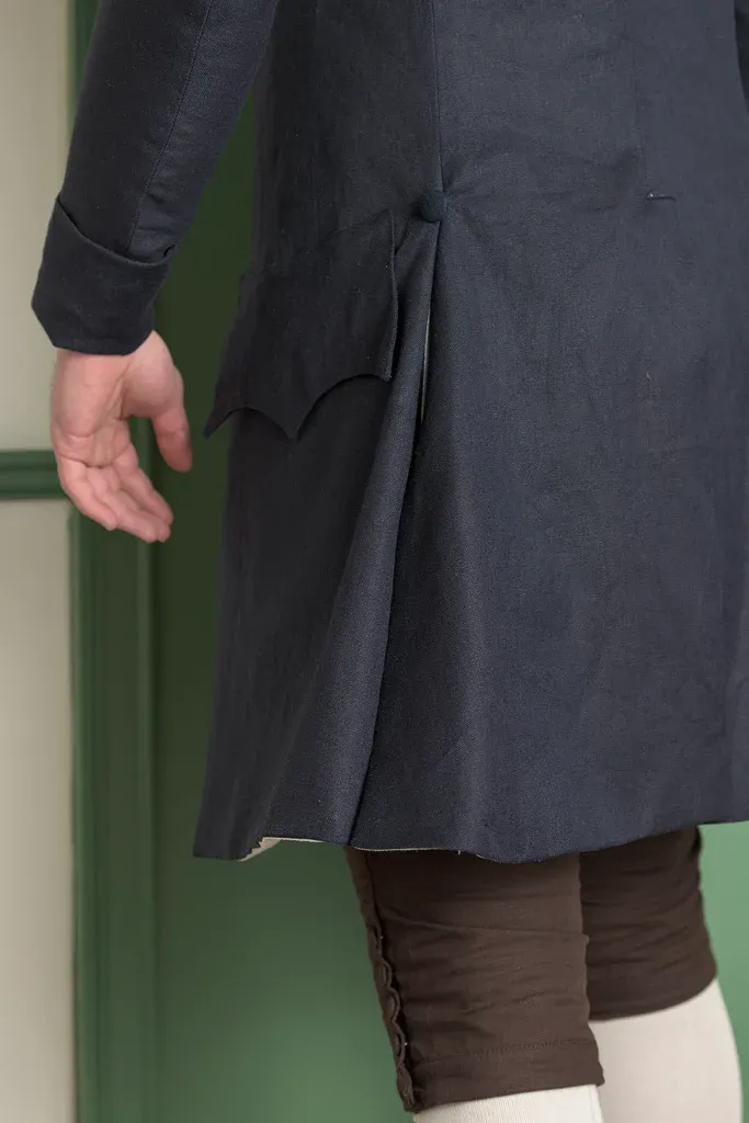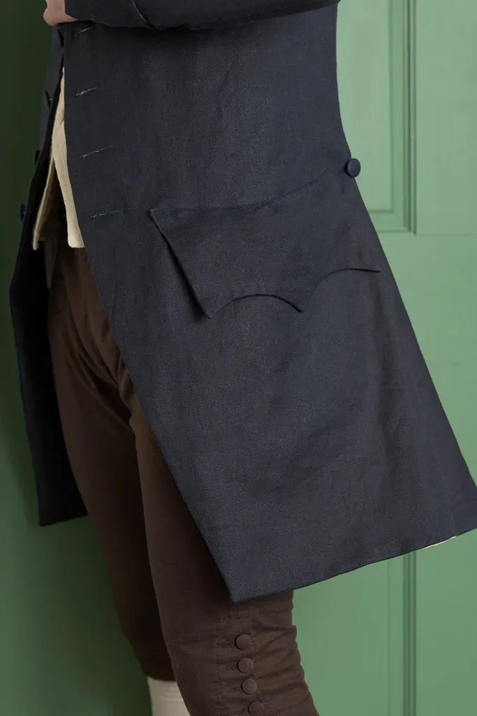 The most common features of the 1770’s frock coat replicated here are the presence of a rounded cape collar, and a center back lapover. This design is well suited for protecting the lower trunk when walking or riding in cool or inclement weather. There was a simplification of construction in the period, with fewer buttons and buttonholes, and often no buttonholes on the plain round cuff and scalloped pocket flap.