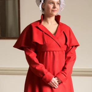 Clean and refined, this white wool redingote evokes the neoclassical elegance of the Regency era. Drawing inspiration from period riding habits and outerwear, the redingote served as both a fashionable statement and a practical garment for cool weather, travel, and daily wear.